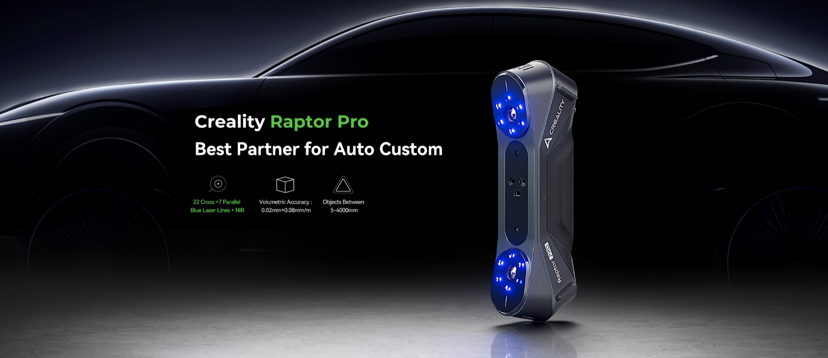 Creality CR Scan Raptor Pro; profesyonel sınıf yüksek hızlı ve ultra hassas 3D tarayıcı çözümüdür. Mavi lazer hatları, çapraz lazer çizgileri ve NIR yapılandırılmış ışık teknolojisi ile hem küçük detaylı nesneleri hem de büyük parçaları hızlı ve yüksek doğrulukla tarar.